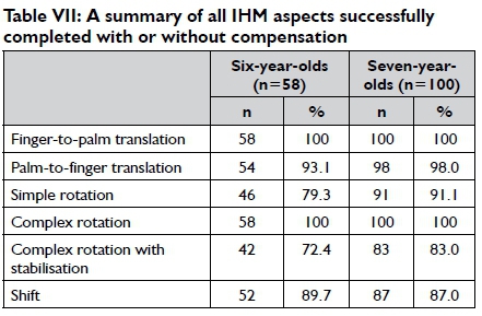 Table VII shows a summary of all the individual aspects of FSU IHM that were completed successfully by the six- and seven-year-old children with or without making use of compensation.