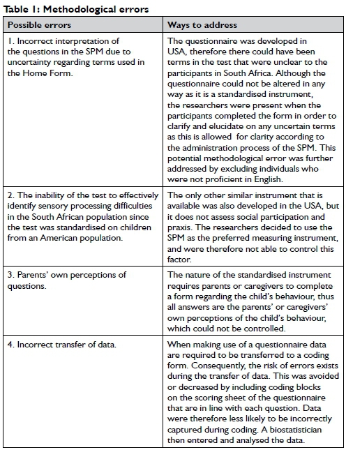 The reliability of this research study lies in the use of a standardised questionnaire and the fact that the researchers were all formally trained in the administration, scoring and interpretation of the questionnaire. One of the researchers is also an occupational therapist well versed within the field of sensory integration.