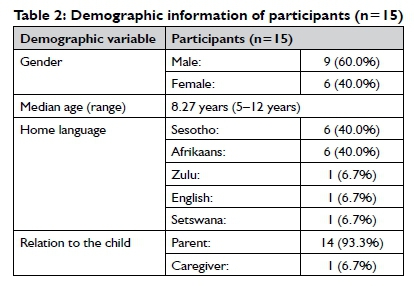 Of the 15 study participants, 14 were parents and one was a caregiver. The children had a median age of slightly over eight years, with nine of them being male.