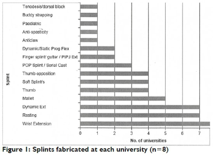 Universities covered a range of splints with almost all teaching their students to fabricate wrist extension (n=8), resting (n = 7) and dynamic extension (n = 7) splints. Refer to Figure 1 for splints fabricated by university.