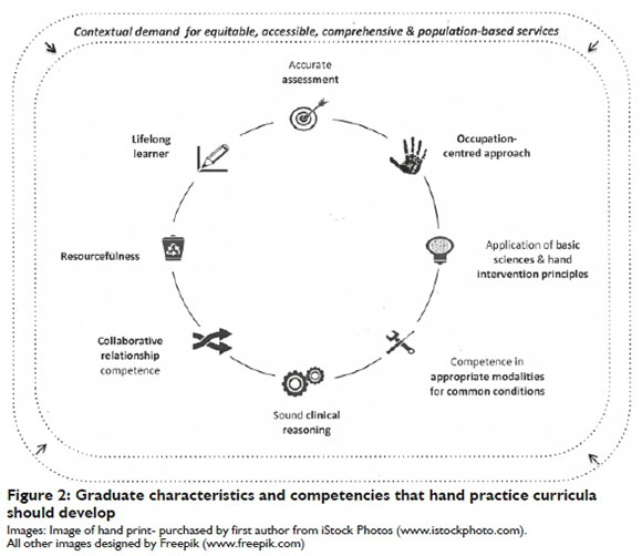 Amongst other implications, it also mandates that graduates are prepared to develop and deliver services that are accessible to all South Africans and appropriate for diverse clients from diverse contexts. Extrapolating from the international and national Minimum Standards for the Education of Occupational Therapists documents25,26 to hand curricula, apart from considering the philosophical applications of a curriculum as a whole, is challenging. However, key concepts need to be considered as a backdrop for preparing graduates for comprehensive hand practice.