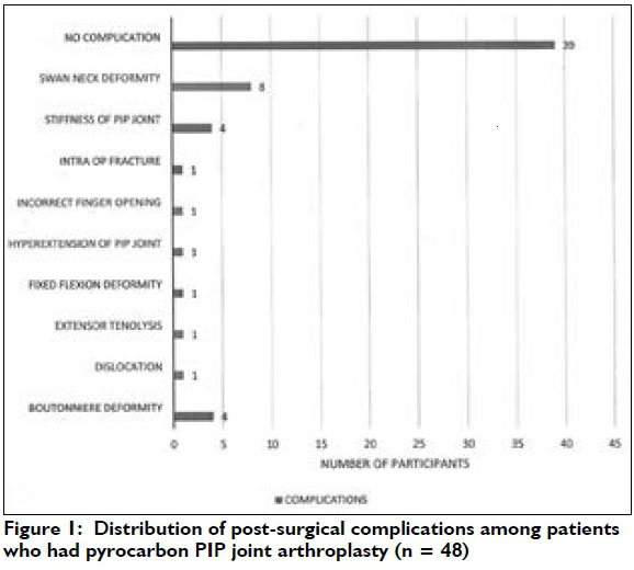 A low average satisfaction score of 3 suggests that a larger proportion of the participants were not happy with the postoperative status of their operated finger. Patients' expectations of surgical outcomes appeared not fully met. This finding further implies that the level of satisfaction might be due to other factors besides pain and reduced ROM, such as the aesthetic appearance of the joint, audible 'squeaking' on active movement and stiffness. A total of 9 participants presented with at least one complication and swan neck deformities was observed in 8 joints. This could have also contributed to the perception of low satisfaction among the participants. Bone quality is another issue with the use of pyrocarbon arthroplasty for post-traumatic PIP joint which could affect outcome of satisfaction, because sclerotic bone may affect component fixation14. Unfortunately, record of bone quality was not available for review in the present study.