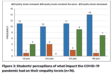 The majority of students (n=74, 66.1%) felt that the COVID-19 pandemic had impacted their empathy levels. Students from each of the four year groups were adequately represented in this response (1st-year = 21.6%, 2nd-year = 18.9%, 3rd-year = 29.7%, 4th-year = 29.7%). The remaining 38 students believed that the COVID-19 pandemic did not have an impact on students' empathy levels. The specific impact that students believed the COVID-19 pandemic had on their empathy levels is represented in Figure 3 (above).