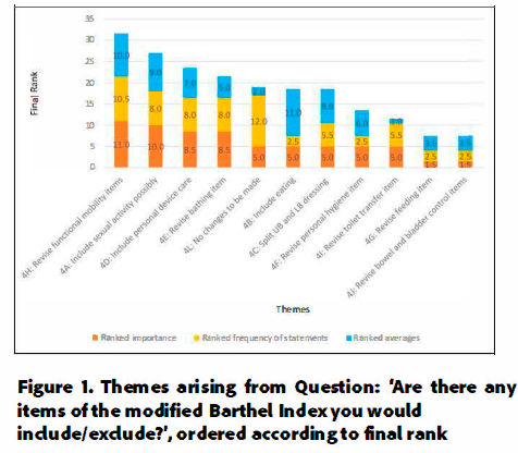 Twelve themes arose from the list of 34 statements generated by the four NGT groups in response to the question "Compare the OTPFIII to the MBI. Are there any items of the MBI you would include/exclude?". As shown in Figure 1 (avove), the highest ranked themes were 'functional mobility' (final rank 31.5/36), 'sexual activity' (final rank 27 /36), and 'personal device care' (final rank 23.5/36) respectively. The theme with the highest ranked frequency of statements is theme 4L which grouped statements that referred to aspects of the MBI that should not be changed.