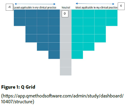 Once the initial sorting had been done, participants continued to a page where the Q grid appeared (Figure 1, page 56). Each of the statements in the three piles were subsequently placed on the grid, by each participant, according to perception of a statement - from most to least applicable to the participant's clinical practice. Statements could be removed and replaced until the participants were satisfied with the placement of their statements. The final placement of the statements by each participant is known as the participant's Q sort placed from most to least as applicable to their clinical practice. The last landing page of the survey, a short post-sort section, invited participants to comment on their Q sorts and the placements of the statements on the Q grid. Participants were given the option to provide feedback by commenting in the QMethod software, or to send a reflection to the researcher via email or to have a short online discussion with the researcher. Only six participants provided feedback, which is a limitation of the study. The researcher recommends in person reflection with each participant take place to ensure the valuable input from participants are not lost.