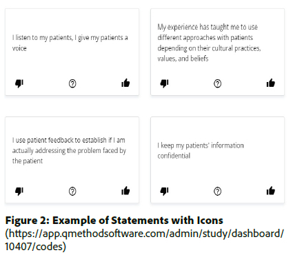 Participants used a link provided by the researcher to access the QMethod Software platform and were requested to provide an individualised participation code (also provided by the researcher). The first landing page of the survey requested participants to consent to participation in the study by choosing between the options 'agree' or 'not agree'. In the next step, participants were instructed to rank each of the statements by choosing an icon (thumbs up, neutral, thumbs down) with regard to the applicability of the statement to their clinical practice setting (Figure 2, below). The statements were automatically placed in three piles, to be used in the next step.