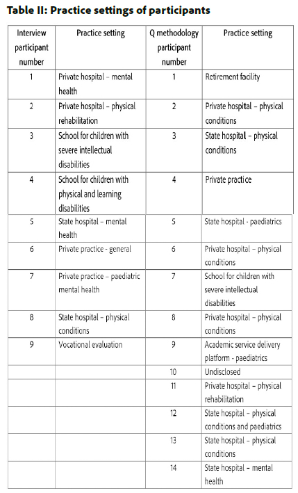 A concourse is a collection of possible statements that, for this study, related to the occupational therapists' knowledge transfer in clinical practice. To build the concourse for the Q sample, published resources and semi-structured interviews are included, as recommended24. For this study, a scoping review was undertaken to determine the landscape of knowledge transfer in occupational therapy clinical practice. The scoping review was followed by semi-structured, digitally audio-recorded interviews with nine occupational therapists from different practice settings (see Table II, adjacent, page 57) in the Free State, South Africa, to gain insight into the content of the knowledge that is transferred in their clinical practice. Interview participants were provided with a definition and an explanation of each of the four types of knowledge that had been identified in occupational therapy literature, namely, propositional knowledge (theoretical/empirical), procedural knowledge (practice experience), personal knowledge (own world view, values, and beliefs), and client knowledge. Inductive thematic analysis was performed to extract statements made by participants in the interviews, to form the concourse25. Statements were also extracted from the literature identified by the scoping review. From the concourse, a Q sample of statements was developed. Including only participants from the Free State, South Africa was a limitation of this study. It is recommended that a follow-up study is conducted amongst occupational therapists practicing in the whole of South Africa.