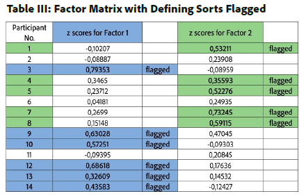 Two factors with eigenvalues greater than 1.00 were extracted. Factor 1 had an eigenvalue of 2.97, while Factor 2 had an eigenvalue of 1.48. A factor represents the collective perspectives of a group of participants27. The final factors are combinations of the statements used in the study. Factor 1 was constructed by Q sorts of participants 3, 9, 10, 12, 13, 14 while Factor 2 was constructed by Q sorts of participants 1, 4, 5, 7, 8. (see Table III, adjacent). Automatic flagging of a Q sort is done to, first, indicate which participants' Q sorts have the highest factor loads and, second, to correlate a participant's Q sort with the final factor25,30.