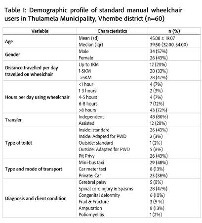 This study involved 60 participants who use a wheelchair for mobility; ages ranging between 18 to 93 years; mean of 45.08 (± 19.07). The sample comprised both males and females. The majority of the participants were males (n=34; 57%). Distances travelled ranged between less than 1 and over 5km. the participants travelled in their wheelchairs was over 5km (n=28; 47%), with the least distance being up to 1km (n=12; 20%). Most participants (n=43; 72%) spent over eight hours a day in their wheelchair, with (n=2; 3%) spending 1-3 hours a day in the wheelchair. A large proportion of the participants (n=48; 80%) were independent in wheelchair transfers. Most of the participants used inside toilets (n=26; 43%), or pit privy toilets (n=26; 43%), whilst PWDs (n=2; 3%). had access to an inside wheelchair adapted toilet Almost half of the participants relied on minibus taxis as a mode of transport (n=29; 48%), a fair amount relied on private cars (n=23; 38%). The most common diagnosis reported was spinal cord injuries (n=28; 47%), with the least prominent diagnosis being poliomyelitis (n=1; 2%). (Table I, page 71).