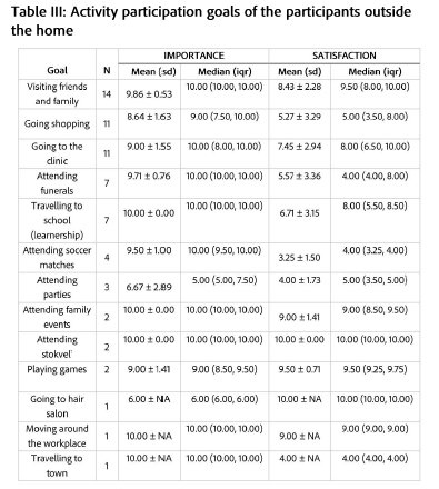 The participants' activity goals outside the home varied. Visiting friends was the most reported by participants (n=14; 23%), with an average importance (mean 9.86 ± 0.53), and a high level of satisfaction (mean 8.43 ± 2.28). Travelling to town, moving around the workplace and going to the hair salon were the least common activity goals amongst the participants (n=1;2%). Travelling to learnership (n=7;12%) was ranked as highly important (mean=10) and average for level of satisfaction (mean 6.71± 3.15). Table III (below) presents a summary of activity participation goals outside the home by the participants. Overall, the wheelchair participants ranked the level of importance of activity participation outside the home as high (mean 9.28 ± 1.38) with an average level of satisfaction (mean 6.72 ± 3.11).