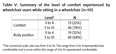 Table IV (below) highlights the self-reported scores of how the participants rated the level of satisfaction related to comfort and body position while sitting in the wheelchair. The participants were given a scale from 0 to 10 to their level of satisfaction related to comfort and body position while in a wheelchair. A value of 0 means that the participant is not at all comfortable/not satisfied at all, whereas a value of 10 means that the participant is extremely comfortable/ extremely satisfied with the comfort and body position when they are using their wheelchair. A mean score of 6.61 ± 2.89 was rated for the level of comfort, and a mean score of 6.25 ± 3.21 was also rated for body position. The majority of the participants (n=54; 92%) had not experienced pressure sores on their buttocks six months prior to data collection whereas five of the participants (8%) had experienced pressure sores in the prior six months.