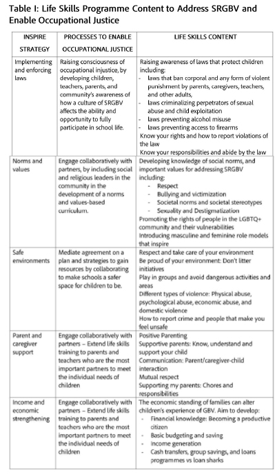 Keywords: SRGBV, human rights, Department of Basic Education (DBE), school-based occupational therapy, occupational justice, life skills interventions, Participatory Occupational Justice Framework, INSPIRE framework