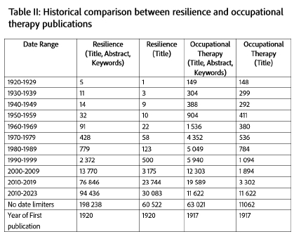 The results for occupational therapy (Table II adjacent), showed a higher number of publications than for resilience up to 1990. However, occupational therapy publications did not follow the rapidly increasing trend that was observed for research in resilience after 1990. A comparison of the trends showed that research in the occupational therapy commenced earlier and remained higher up to 2009, but that the increase since then was more gradual.