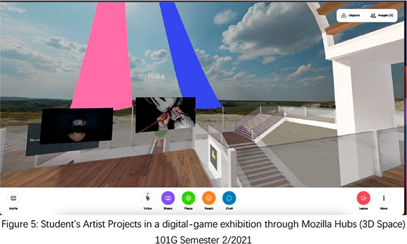 We have encouraged students to allow their work to be seen in process, witnessed in different phases by each other. Students have received and offered feedback and experimented with the assignments as opportunities for arranging idiosyncratic creative projects around shared assignment briefs. Final projects for the course were shared in a virtual gallery space using the 3D spaces of Mozilla Hubs. This offered a game-like situation in which students could place their work in different digital rooms. Wandering through, they were able to find their peers, view a diverse range of approaches and share conversations in real time. This brought focus to the social aspects of sharing creative processes and created opportunities to comment on each other's achievements and laugh at the awkwardness of walking with their avatars in the digital gallery, to some extent relieving the stress of typical final assessment.