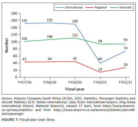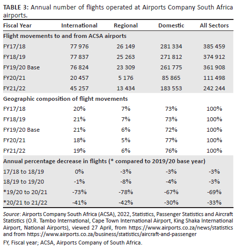 The study is based on the annual aggregation of monthly statistics for passengers and flights operated published by the Airports Company South Africa (ACSA), split into three markets: international (intercontinental), African regional and South African domestic routes. International Civil Aviation Organization also publishes charts of the daily number of flight departures for major South African airports (including Johannesburg and Cape Town airports) (ICAO 2022a), but does not distinguish between the three geographic areas. International Air Transport Association also publishes monthly Air Passenger Market Analysis (revenue passenger kilometres [RPKs] and Available Seat Kilometres [ASKs]) for the whole African region but does not identify the numbers for South Africa apart from all African countries.