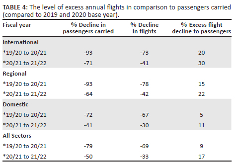 As a result, airlines have not successfully balanced capacity (flights operated) to the lower level of demand in South Africa. This implies a mismatch between direct operating costs and the revenue from lower demand levels. Apart from the decline in demand, the average passenger loads per flight reduced compared to the pre-COVID-19 base fiscal year. This would, on average, reduce the airlines' load factors and exacerbate their financial plight in the subsequent recovery periods.