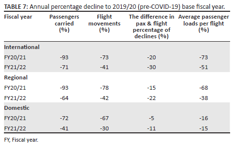Following capturing and tabulating the ACSA data for passengers carried per market, the percentage difference to the previous year's numbers is calculated until the base fiscal year of 2019/20. After that, a comparison is made comparing the first and second post-COVID-19 lockdown years (2020/21 and 2021/22) to the base fiscal year 2019/20, expressed as a percentage of the volumes achieved during the 2019/20 (base) fiscal year to demonstrate the percentage of decline from the pre-COVID-19 baseline (in each geographic market) as is used by most international organisations (ICAO 2022b) to demonstrate the level of recovery from the pre-COVID-19 annual traffic base.