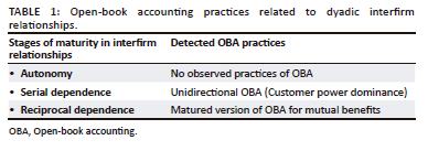 Inter-firm relationships evolve through stages: autonomy to serial dependence, serial dependence to reciprocal dependence and reciprocal dependence to mutual dependence (Gurcaylilar-Yenidogan & Erdogan 2023). Table 1 illustrates the alignment of OBA practices as an inter-organisational technique alongside these stages of maturity in supply-chain relationships. Open-book accounting practices align with these stages in supply-chain relationships, emphasising OBA's role in facilitating collaboration. Unidirectional OBA, observed in serial dependence, shows power asymmetry. Empirical studies focus on this version, limiting supplier rights. Advancing to reciprocal dependence allows increased accounting information sharing among partners. A matured OBA phase supports collaboration, involving multifunctional teams managing supply chains. The progression to ideal supply-chain relationships may involve an ideal OBA. Lima et al. (2023) found that OBA can enhance trust and collaboration in mutual dependence relationships, but challenges may arise because of weaknesses in firms' internal cost systems.