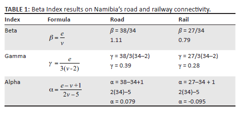 The gamma (γ) index (Equation 2) calculates the ratio of the actual number of edges to the maximum possible number of edges in a network. In the case of a planar graph, this index can be computed as the number of actual links divided by the maximum number of links. It is vital to compare the structures of different networks, such as Namibia's road and rail network structures. The γ index ranges from 0 to 1 and can provide valuable insights into the accessibility and connectivity of a network. The study conducted in the context of this discussion utilised the γ index to measure the accessibility and connectivity of the rail and road networks, as shown in Figure 5. This analysis's results help to assess the efficiency and effectiveness of these networks in facilitating transportation, which is denoted by the formula in Equation 2: Gamma Index formula (Rodrigue 2020):