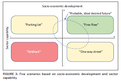 The drivers, trends, technologies as well as challenges and opportunities for the road transport sector were used to develop five potential scenarios for the roads transport sector on a 15-year horizon. This then allowed for the development of a description of the desired, probable future state of the road transport sector (scenario five) through qualitative analysis of the data from the desktop study, inputs from the interviews and data from stakeholder workshops. This was done by using a classical foresight approach where extreme scenarios are developed based on two intersecting major drivers, in this case socio-economic development and sector capability.