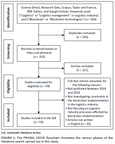 The SLR included journal articles that pertained to or provided insights into: (1) blockchain technologies, (2) constraints in the implementation of blockchain technologies in the logistics industry, (3) the logistics processes influenced by the implementation of blockchain technologies, or (4) a combination of these aspects. For this article, the authors reviewed all article topics and abstracts; if abstracts were unavailable, the introduction was read. Articles not relevant to these four points were excluded from the review.