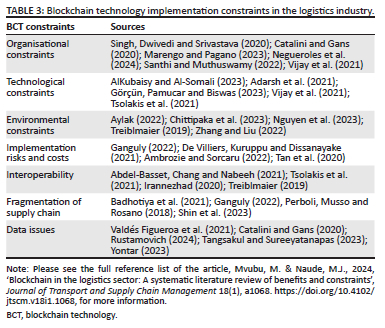 The following section outlines the constraints hindering the implementation of BCT in the logistics industry.