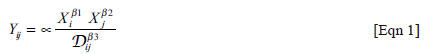 The gravity model, traditionally used in modelling the international trade of goods, has been expanded to include international trade in services particularly in the context of freight transport (Bektas 2017; Ghisolfi et al. 2022; Tavasszy & De Jong 2013). This adaptation allows for a more comprehensive analysis of the factors influencing freight transport and trade flows in services. It provides valuable insights into the dynamics of international logistics and transportation networks. The gravity equation can be considered a short-hand representation of supply and demand forces (Head 2003). The earliest gravity model constructed was as follows (Equation 1):