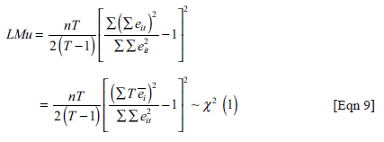 . Baltagi (2005) presents the LM statistics follows the chi-squared distribution as follows (Equation 9):
