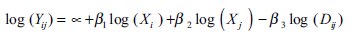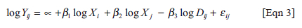 where Yij is the exports or imports of freight transport from country i to country j, ∝ is a constant; Xi and Xj represent the economic mass of the exporting or importing countries, respectively, and Dij is the distance between the countries. The logarithmic transformation of the previous equation translates in the following linear function (Equation 2):