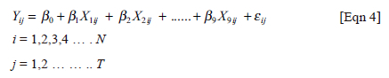 where Yij is the dependent variable for entity i at time j. X1ij, X2ij., X9ij are the independent variables, β0, β1 …. β9 are the coefficients and εij is the error term. The POLS estimating model would not account for the endogeneity problem. Endogeneity occurs when an explanatory variable is correlated with the error term. The presence of endogeneity can lead to bias and inconsistent parameter estimates and undermining the validity of the model (Wooldridge 2010). Baier and Bergstrand (2007) stated one way to account for endogeneity bias is to use the fixed effects model (bilateral fixed effects and country-and-time effects).
