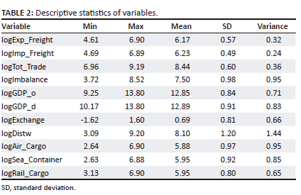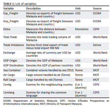 In this study, the gravity model will be fitted to two models, which is the exports and imports of freight. Table 1 summarises the variables, definitions and data source: