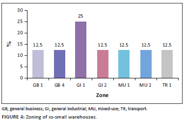 As depicted in Figure 4, of the eight xx-small warehouses (with building footprints ranging from 1 m2 to 200 m2) in the City of Cape Town, 25% were situated on the premises zoned GI 1. The GB 1, GB 4, GI 2, MU 1, MU 2 and TR 1 zones each accommodated 12.5% of the xx-small warehouses.