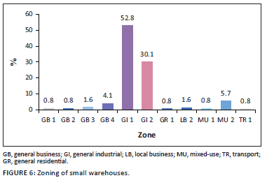 As depicted in Figure 6, of the 123 small warehouses in the City of Cape Town (with building footprints ranging from 2001 m2 to 8000 m2), 52.8% were positioned on the land zoned GI 1, followed by GI 2 at 30.1%.