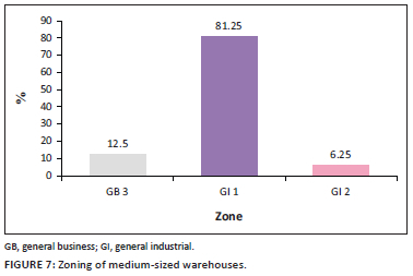 Figure 7 depicts that of the 16 medium-sized warehouses within the City of Cape Town (with building footprints ranging from 8001 m2 to 15000 m2), a significant majority (81.25%) were located within the premises zoned GI 1, followed by GB 3 at 12.5% and GI 2 at 6.25%.