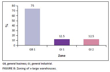 As depicted in Figure 8, of the eight x-large warehouses within the City of Cape Town (with building footprints ranging from 20001 m2 to 40000 m2), three-quarters were on the land zoned GB 1, followed by GI 1 and GI 2 at 12.5% each.