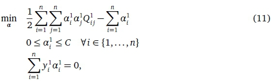 and K(.,.) is a Mercer's kernel function, which allows non-linear mappings of the training data (Cortes & Vapnik, 1995). We obtain the solution of Eq. 11 i.e. α1Vi by using the efficient CCQP solvers already developed in the literature (Hsieh, Si, & Dhillon, 2014). Finally, we estimate the SVM by using the α1as