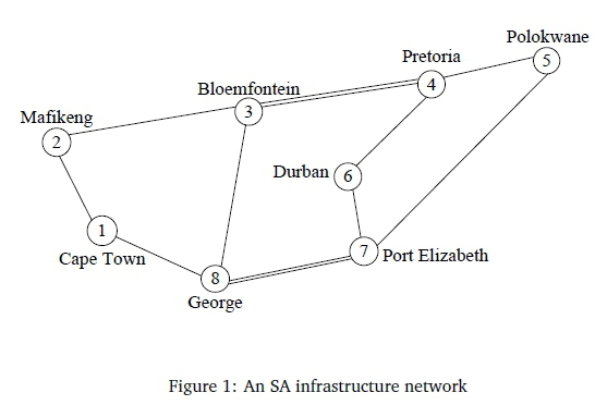 An application of our algorithm to the network topology shown in Figure 1 is next introduced. The network model consists of 8-nodes and 10-links which is a fictitious network connecting eight South African cities in different provinces to compute the optimal link capacities. Each link carries traffic in both directions. The double lines between nodes 3 and 4 and 7 and 8 indicate that there are two links in each direction connecting these nodes. The network carries 2 traffic classes: the bandwidth requirement of the first class is 1 unit and the bandwidth requirement of the second class is 40 units.