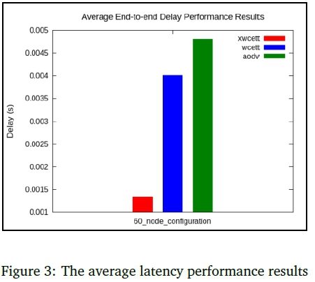 Experiments were conducted in varied network sizes. In total, five (5) scenarios were considered to investigate how the network size affects the performance of the xWCETT routing protocol and to examine the behaviour of the xWCETT protocol given the dynamics inherent in the multi-hop CRN environment. The performance of the routing protocols was evaluated in terms of the average end-to-end latency, throughput, jitter, packet delivery ratio (PDR), and the normalised routing overhead (NRL). The results are based on the network size with sixty (60) SU nodes and six (6) PU nodes. In Figure 3, we present the average end-to-end latency results.