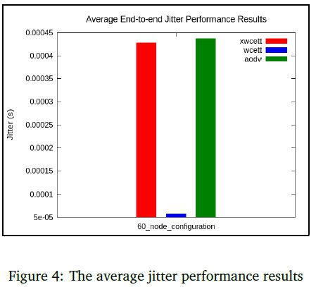We can observe that the average xWCETT latency is lower compared with AODV and WCETT. The AODV and WCETT routing protocols had higher latency because they are not designed for the cognitive radio environment. The performance of AODV and WCETT degrades due to dynamics in the operating environment such as availability of spectrum. The sporadic availability of the spectrum causes WCETT and AODV to suffer increased delays. In Figure 4, we present the comparative average jitter results obtained by the three routing protocols.