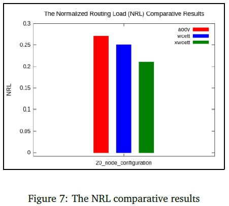 The PDR results show that xWCETT achieved the highest percentage of PDR. This shows that xWCETT protocol loses fewer packets compared to the WCETT and AODV protocols. Longer path repairs degrade PDR in the AODV and WCETT protocols. The xWCETT repairs routes faster. The NRL results are presented in Figure 7.