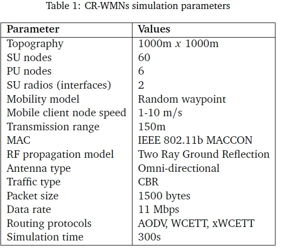 The xWCETT routing protocol was implemented based on the multi-radio multi-channel architecture. The TCL script was used to configure the number of radios and channels required for the simulations. In our study, the number of radios was set to two (2) and the number of channels assigned to each radio was set to four (4) to closely emulate the ideal functionality of the CR-WMNs.