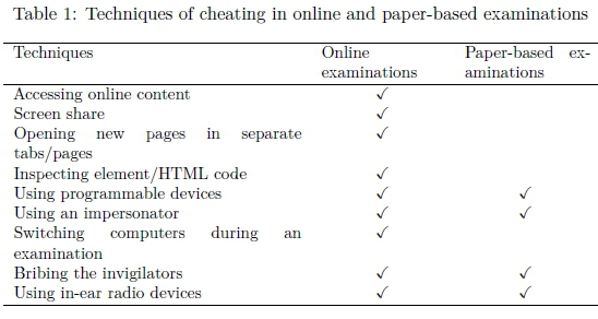 To further elaborate on the issue of OEF, Table 1 shows some of the techniques that students use to cheat in online examinations. Two columns are shown: the middle column represents methods that are known to happen in online examinations and other methods that strictly happen in paper-based examinations are shown in the column on the right. This study concentrates on techniques used in online examinations.
