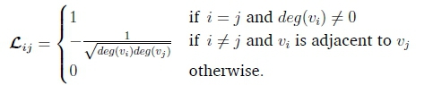 An alternative shift operator derived from A is the Laplacian Matrix, L (Cheung et al., 2018; Narang & Ortega, 2012; Sakiyama et al., 2019; Shuman et al., 2011; Tremblay et al., 2018). This is the difference of a graph's degree matrix D (whose diagonal entries gives the number of edges protruding from the corresponding node) and its adjacency matrix. Hence the Laplacian is defined by L = D - A. Finally, the most important shift operator to be used in this paper is the symmetric normalised Laplacian, L (Narang & Ortega, 2012; Sakiyama et al., 2019). The symmetric normalised Laplacian is given by L = DLD = I - D AD, with: