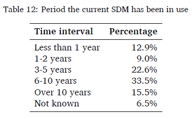 The respondents were asked how much time they had spent using the SDM. The results presented in Table 12 show that 71.6% of the respondents indicated that they had been using their SDM for at least three years.