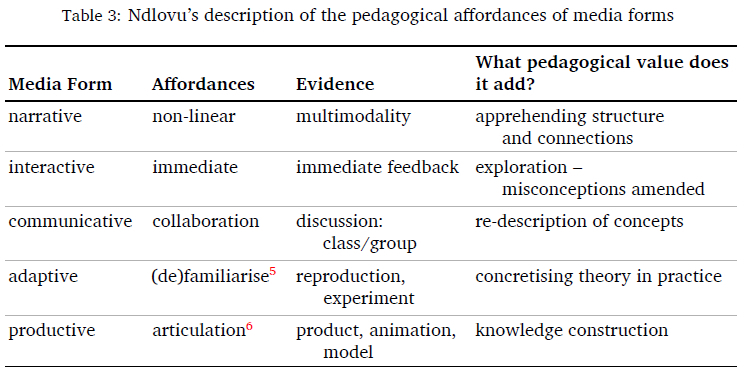 Media and modes can be mixed and matched in teaching - "the medium does not determine the form of learning. The teacher does that, by using it to convey what is to be done and what is to be learned" (Laurillard, 2012, p. 105). It is within this recognition that Ndlovu considered evidence of how teachers were using the affordances of ICTs in their classrooms. Evidence of multimodality was found (or not found) in the integration of different modes of communication, linked to narrative media used to deliver content "beyond linear pathways of learning". Immediacy was found in the use of ICTs by learners to solicit quick responses in the online learning environment. Laurillard (2002) associates this affordance with the ability to navigate with ease and control viewing of content. Collaboration was seen in easy communication with the teacher in online learning. (De)familarisation was found in the ability of ICTs to present learners with other people's experiences, "to make the strange familiar and the familiar strange" in exploring diversity and inequality!(Sikes, 2003). Articulation was evidenced in learners' ability to create their own models of the descriptions of the world. All of these affordances can be realised using both digital and non-digital media forms (Ndlovu, 2015, pp. 34-36). Laurillard (2012, p. 148) contends that, whatever the multimedia we use, the important thing is that we "understand the contrasting affordances of these different media, and their differential value for learning."