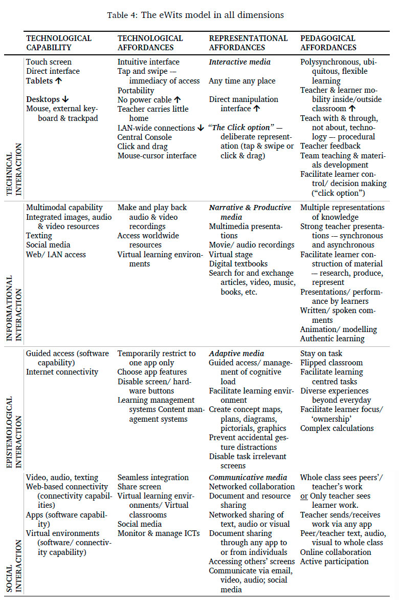 We understand that there is not one all-embracing theory that can grasp the complexity of teacher knowledge and practice. However, we put forward eWits as a framework which we believe teachers can use to understand and thoughtfully integrate ICT affordances in their classrooms. Reading Table 4 from left to right, they will be able to see the potentialities in the technology that might enhance their teaching. Reading it from right to left will assist them to recognise what they should choose to integrate in their classroom activities. We also suggest that a similar reading of the eWits model can guide further research on successful (and unsuccessful) teaching with technology, and also curriculum development in teacher education related to the pedagogical integration of the pedagogical affordances of ICTs by teachers.