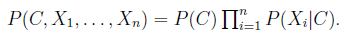 Each instance could fall into one of these classes and this is represented as a latent class variable. The model also poses some observed sets of features X1,..., Xn. The assumption is that all of the features are conditionally independent given the class label of each instance. That is,