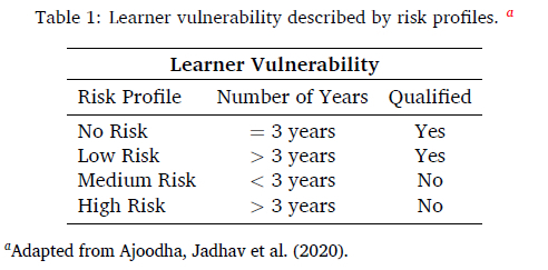 This document is structured as follows: Section 2 highlights the state-of-the-art contributions in the domain of predicting at-risk learner profiles, and a selected conceptual framework for learner vulnerability; Section 3 highlights the data, feature selection, and choice of predictive models; Section 4 outlines the major findings; and Section 5 presents the implications of this paper, outlines the contributions, and puts forward recommendations for future work.