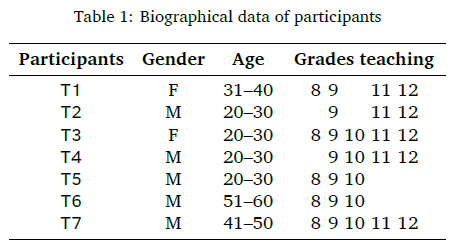 There was no apparent reason for gender, age, and experience preference in this study, however, it does provide the context and background of the participants. As Table 1 illustrates, five of the participants were the so-called digital natives (born after 1980), while the other two participants are digital immigrants (born before 1980) (Prensky, 2001). All the participants teach Grade 9, however, some of the participants also teach subjects that range from Grades 8 to 12 (Table 1). The influence of gender, age, and experience was not investigated, since a previous study (Abukhattala, 2016) found that these factors do not influence digital technology integration in secondary schools.