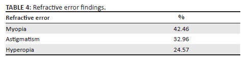 The distribution of spectacle wear was assessed against refractive error type (Table 4), categorising these into myopia, hyperopia and astigmatism.